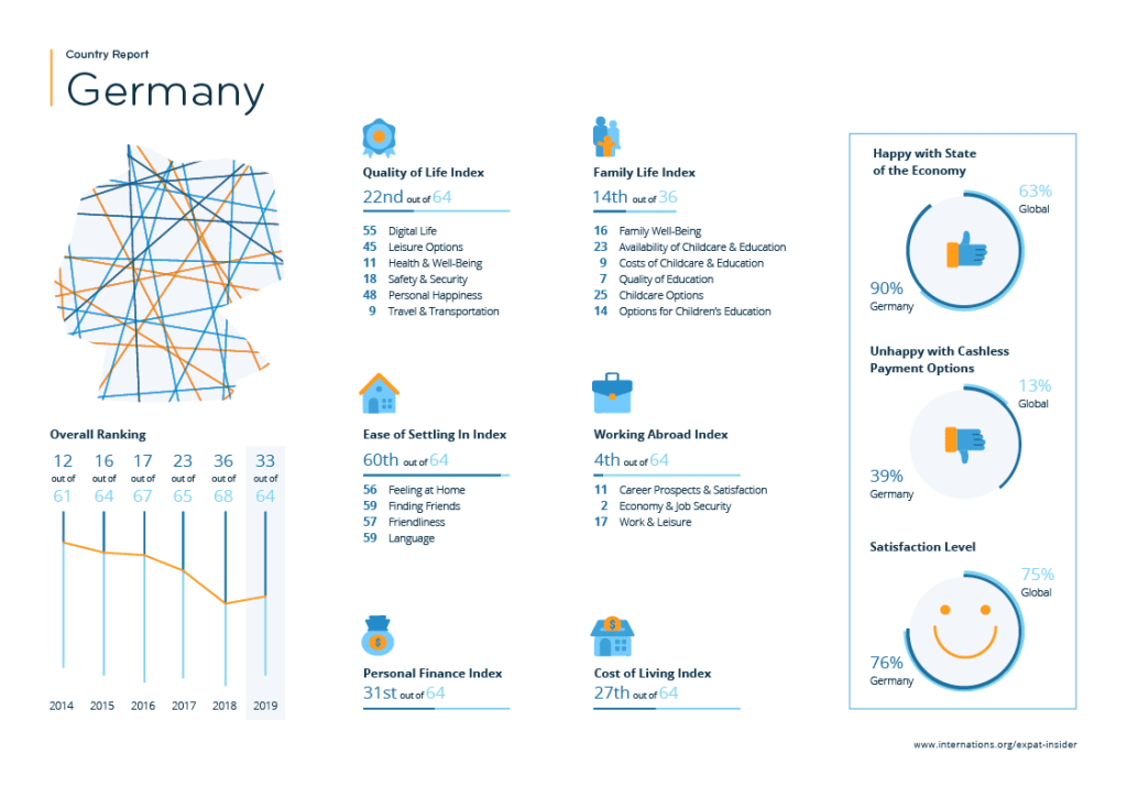 Denn obwohl Deutschland für ausländische Studierende unter den beliebtesten Zielen ist, rangiert es für ausländische Fachkräfte laut einer OECD-Studie nur auf Rang 11. Auch in einer Befragung von InterNations (Expat Insider 2019) landet Deutschland insgesamt im Mittelfeld. Die deutsche Wirtschaft wird zwar als sehr stabil eingeschätzt und Arbeiten in Deutschland als sehr positiv wahrgenommen. Darüber hinaus kritisieren die Befragten jedoch vor allem die digitale Infrastruktur (WLAN, bargeldloses Zahlen etc.) sowie die schwierige Eingewöhnung (soziale Kontakte knüpfen, Freundlichkeit etc.) in Deutschland.