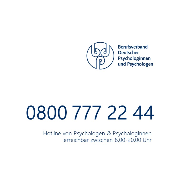 Der Berufsverband Deutscher Psychologinnen und Psychologen (BDP e.V.) bietet in den kommenden Wochen eine besondere Form der psychologischen Beratung an: die BDP-Corona-Hotline. Realisiert wird diese durch den ehrenamtlichen Einsatz der Mitglieder des BDP. Die Hotline (0800 777 22 44) ist täglich von 08:00 bis 20:00 Uhr geschaltet.